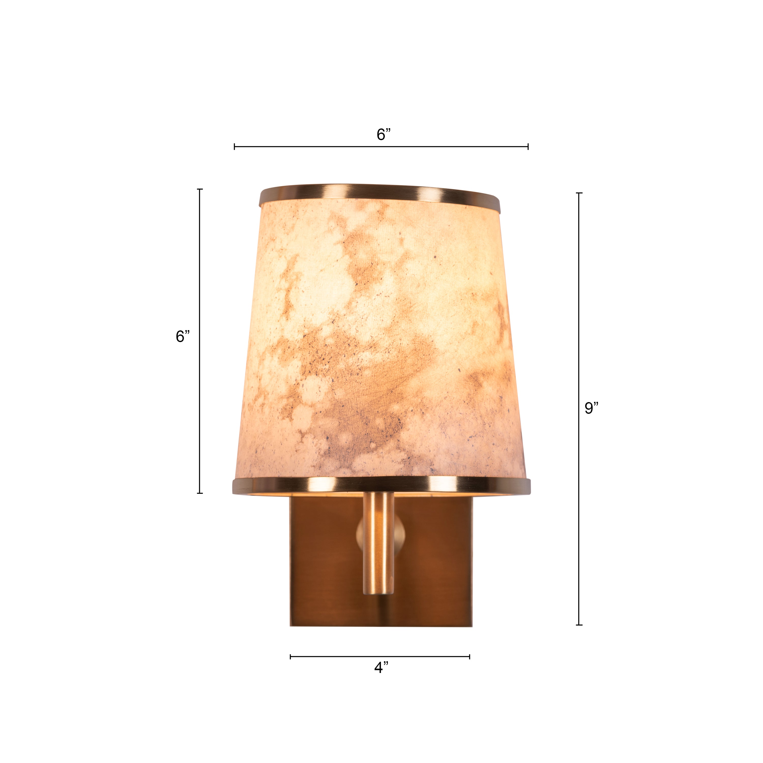 An incredibly beautiful wall light with a matte gold body, this piece features a shade made using a veneer of actual natural stone. The stone veneer is created through a painstaking procedure wherein the stone sheet is made thin enough to be translucent and then reinforced with plastic to retain the shape. The golden accents on this shade enhance the beauty of this design beautifully.
