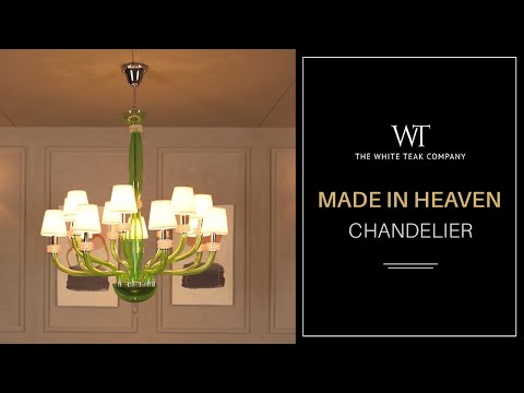 The Made In Heaven chandelier blends the coloured glass technique with modern design. This chandelier showcases rich, jewel-toned green glass that forms the base, radiating a sense of calm and refinement. The chandelier's graceful arms feature delicate swagging, adorned with contrasting clear glass embellishments that add freshness. Cream-coloured lampshades complete the look, offering a soft, warm glow that beautifully contrasts with the vibrant green glass. This chandelier makes a bold yet sophisticated statement in any space, perfect for summer-inspired vintage eclectic spaces.